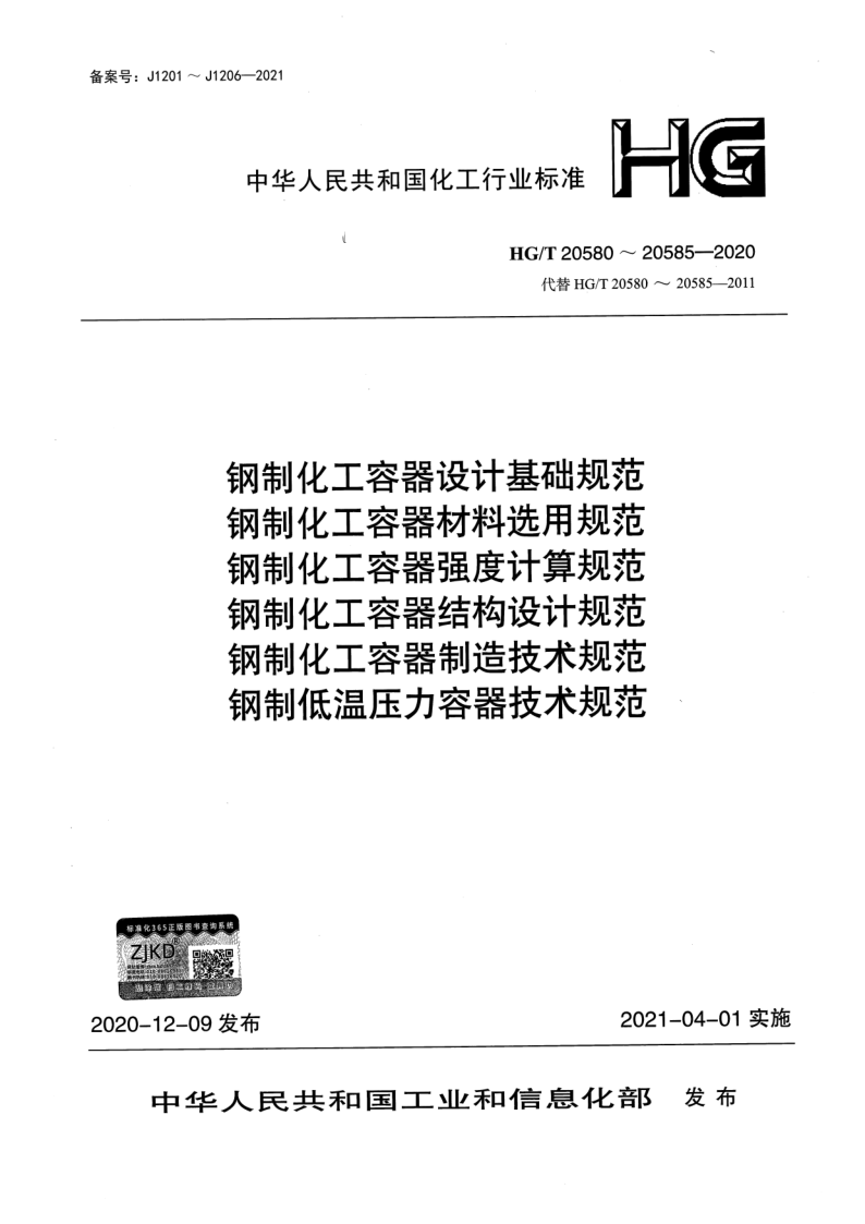本标准为HG/T 20580-2020,标准的中文名称为钢制化工容器设计基础规范(附条文说明),标准的英文名称为Standard for design base of steel chemical vessels,本标准在2020-12-09发布,在2021-04-01开始实施。